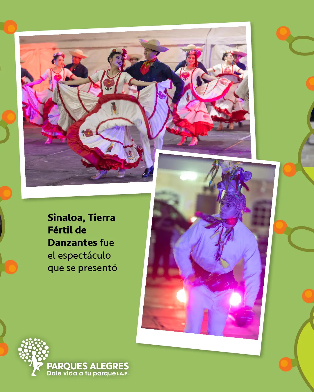 Entre vecinas y vecinos atraídos por la música y familias que permanecían en el parque, la compañía tomó el escenario. El espectáculo rindió homenaje a las y los investigadores y creadores que han dado identidad al folclor sinaloense. En honor a esa herencia, la presentación llevó por título “Sinaloa, Tierra Fértil de Danzantes”.